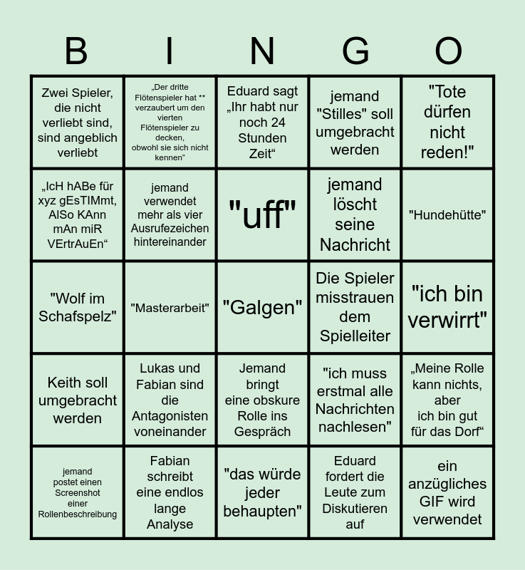 This bingo card has 25 words: Lukas und Fabian sind die Antagonisten voneinander, "das würde jeder behaupten", "uff", jemand postet einen Screenshot einer Rollenbeschreibung, "Tote dürfen nicht reden!", Zwei Spieler, die nicht verliebt sind, sind angeblich verliebt, „IcH hABe für xyz gEsTIMmt, AlSo KAnn mAn miR VErtrAuEn“, „Der dritte Flötenspieler hat ** verzaubert um den vierten Flötenspieler zu decken, obwohl sie sich nicht kennen“, Die Spieler misstrauen dem Spielleiter, Jemand bringt eine obskure Rolle ins Gespräch, jemand löscht seine Nachricht, "Wolf im Schafspelz", "ich muss erstmal alle Nachrichten nachlesen", „Meine Rolle kann nichts, aber ich bin gut für das Dorf“, jemand verwendet mehr als vier Ausrufezeichen hintereinander, ein anzügliches GIF wird verwendet, "ich bin verwirrt", Eduard sagt „Ihr habt nur noch 24 Stunden Zeit“, "Hundehütte", "Masterarbeit", "Galgen", Fabian schreibt eine endlos lange Analyse, Keith soll umgebracht werden, jemand "Stilles" soll umgebracht werden and Eduard fordert die Leute zum Diskutieren auf.