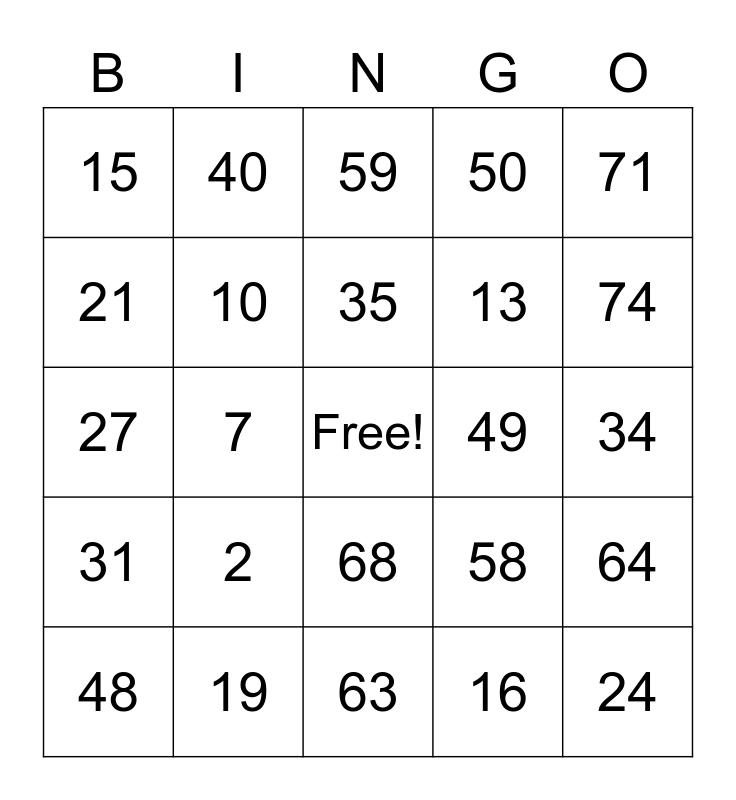 This bingo card has a free space and 24 words: 2, 19, 35, 48, 71, 15, 21, 40, 49, 68, 13, 27, 58, 64, 10, 16, 34, 59, 74, 7, 24, 31, 50 and 63.