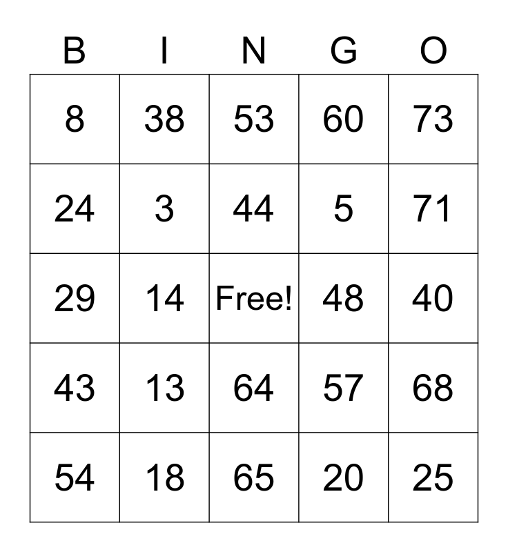 This bingo card has a free space and 24 words: 13, 18, 44, 54, 73, 8, 24, 38, 48, 64, 5, 29, 57, 68, 3, 20, 40, 53, 71, 14, 25, 43, 60 and 65.
