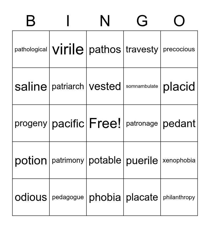 This bingo card has a free space and 29 words: odious, orthopedics, pacific, pacify, pathological, pathos, patriarch, patrimony, patronage, pedagogue, pedant, philanthropy, phobia, placate, placid, postmortem, potable, potion, precocious, progeny, puerile, renaissance, somnambulate, saline, travesty, virile, xenophobia, vested and voracious.