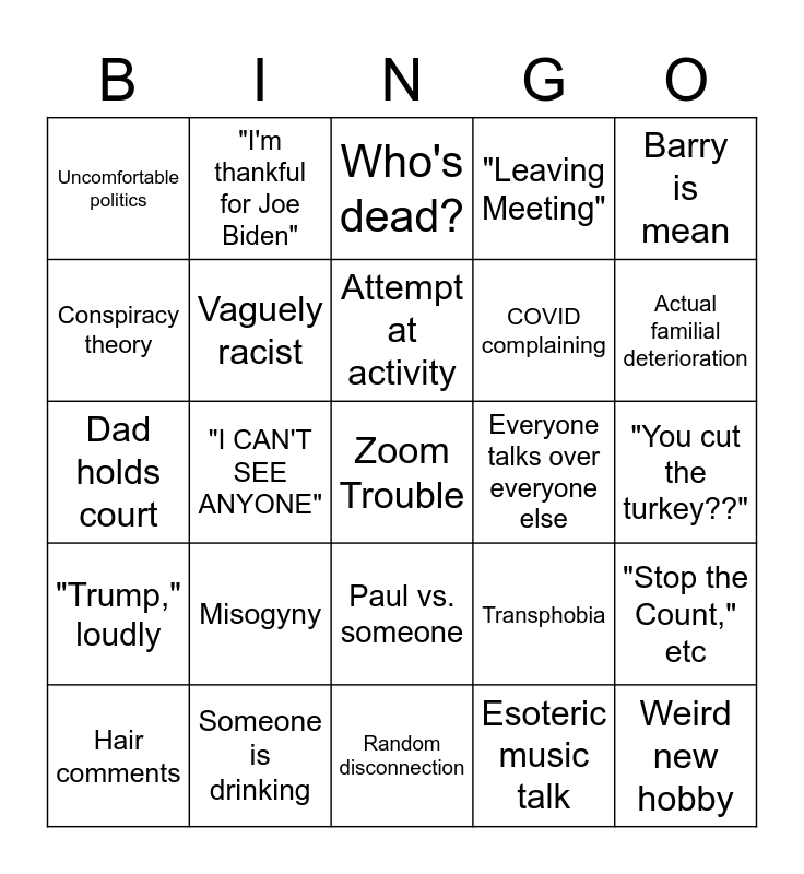 This bingo card has a free space and 28 words: "Stop the Count," etc, Someone ruins trivia night, COVID complaining, Esoteric music talk, Conspiracy theory, Who's dead?, "I'm thankful for Joe Biden", "Trump," loudly, Everyone talks over everyone else, Hair comments, Dad holds court, "Leaving Meeting", Someone is drinking, Random disconnection, Actual familial deterioration, Clinical depression, Misogyny, Vaguely racist, Attempt at activity, Paul vs. someone, Uncomfortable politics, Grandma weird movie, Weird new hobby, "I CAN'T SEE ANYONE", "You cut the turkey??", Transphobia, Barry is mean and Reference to earlier Zoom call.