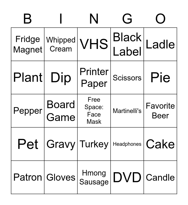 This bingo card has a free space and 44 words: Favorite Blanket, Candle, Shot, Patron, Christmas Ornament, DVD, VHS, Spatula, Ladle, Gloves, Black Label, Martinelli's, Turkey, Gravy, Mashed Potatoes, Hmong Sausage, Sticky Rice, Pepper, Ham, Pie, Whipped Cream, Eraser, Colored Pens/Pencils, Fridge Magnet, Childhood photo, Favorite Beer, Christmas Present, Glasses, Headphones, Pet, Fruit, Cake, Fawm Kauv, Deck of Cards, Board Game, Coaster, Child, Disney item, Printer Paper, Plant, Scissors, Chips, Dip and Toilet Paper.