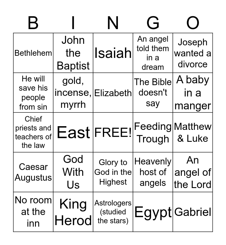 This bingo card has a free space and 24 words: God With Us, King Herod, Elizabeth, No room at the inn, Joseph wanted a divorce, Bethlehem, He will save his people from sin, John the Baptist, Feeding Trough, Glory to God in the Highest, The Bible doesn't say, Chief priests and teachers of the law, Heavenly host of angels, An angel of the Lord, gold, incense, myrrh, Egypt, Matthew & Luke, Isaiah, A baby in a manger, East, Gabriel, Caesar Augustus, An angel told them in a dream and Astrologers (studied the stars).