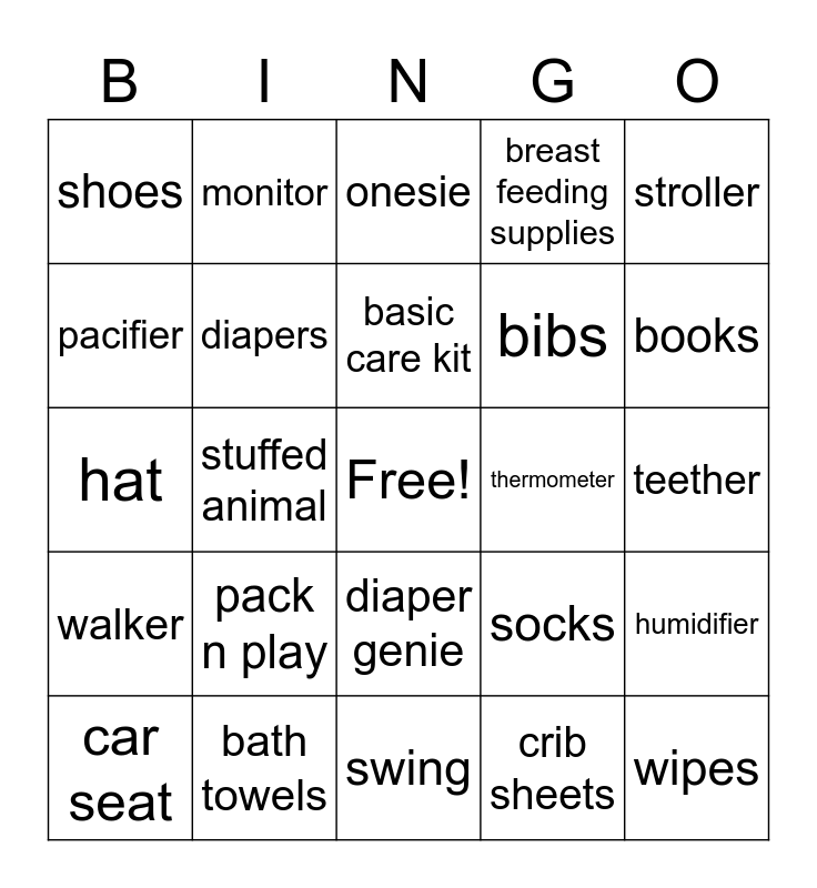 This bingo card has a free space and 29 words: car seat, blanket, stuffed animal, bottles, shoes, onesie, diapers, pack n play, thermometer, bath towels, teether, wipes, swing, crib sheets, books, bassinet, diaper genie, walker, stroller, hat, socks, burp rags, bibs, pacifier, breast feeding supplies, monitor, humidifier, basic care kit and baby toys.
