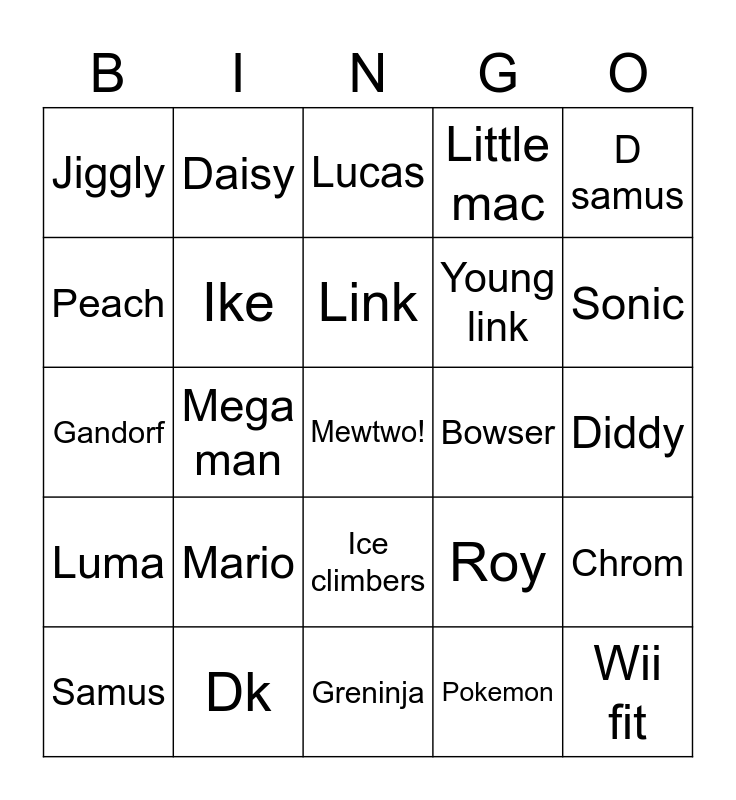 This bingo card has a free space and 24 words: Mario, Dk, Link, Samus, D samus, Jiggly, Peach, Daisy, Bowser, Ice climbers, Young link, Gandorf, Roy, Chrom, Ike, Pokemon, Diddy, Lucas, Sonic, Mega man, Wii fit, Luma, Little mac and Greninja.