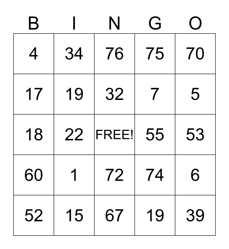 This bingo card has a free space and 24 words: 1, 15, 32, 52, 70, 4, 17, 34, 55, 72, 7, 18, 74, 6, 19, 19, 53, 76, 5, 22, 39, 60, 75 and 67.