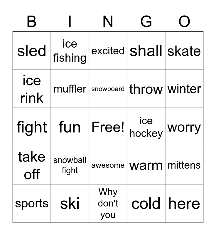 This bingo card has a free space and 24 words: snowball fight, ski, snowboard, sports, skate, sled, ice rink, ice fishing, ice hockey, awesome, throw, fight, warm, mittens, muffler, cold, worry, excited, winter, fun, here, take off, shall and Why don't you.