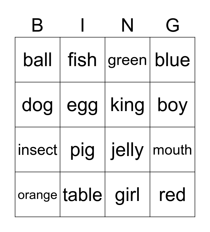 This bingo card has 26 words: Free!, apple, boy, cat, dog, ball, egg, fish, girl, hat, insect, jelly, kite, leg, mouth, nose, blue, red, green, orange, pig, sun, table, umbrella, king and queen.
