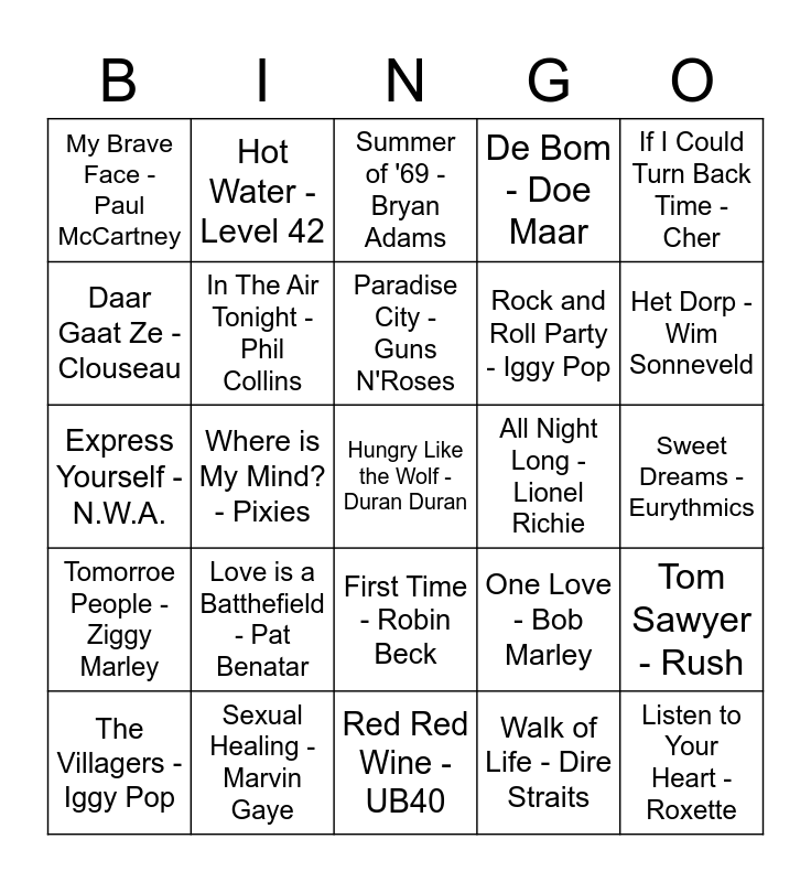 This bingo card has 83 words: Free!, Sunday Blooday Sunday - U2, Summer of '69 - Bryan Adams, The Tide is High - Blondie, Hello - Lionel Richie, Crazy Little Thing Called Love - Queen, Every Breath You Take - The Police, I'm Still Standing - Elton John, Sing Our Own Song - UB40, Don't Break This Rhythm - Peter Gabriel, Rhythm Nation - Janet Jackson, Like a Prayer - Madonna, In The Air Tonight - Phil Collins, All Night Long - Lionel Richie, Need You Tonight - INXS, My Brave Face - Paul McCartney, The Villagers - Iggy Pop, Daar Gaat Ze - Clouseau, Zij Gelooft In Mij - Andre Hazes, You Give Love A Bad Name - Bon Jovi, Give It To Me Baby - Rick James, Rock and Roll Party - Iggy Pop, Hungry Like the Wolf - Duran Duran, Nikita - Elton John, Where is My Mind? - Pixies, With or Without You - U2, Straight Outta Compton - NWA, Bloedend Hart - De Dijk, The Winner Takes It All - ABBA, Hold the Line - TOTO, Love is a Batthefield - Pat Benatar, Careless Whisper - George Michael, Clore to Me - The Cure, Express Yourself - N.W.A., Listen to Your Heart - Roxette, Push It - Salt-N-Pepa, Red Red Wine - UB40, Club Tropicana - Wham!, Het Dorp - Wim Sonneveld, Tomorroe People - Ziggy Marley, Stiekem Gedanst - Toontje Lager, Ik Voel me Zo Verdomd Alleen - Danny de Munk, Somebody's Watching Me - Rockwell, Got My Mind Set on You - George Harrison, Super Freak - Rick James, Over de Muur - Klein Orkest, Hot Water - Level 42, Don't You - Simple Minds, Don't You Want Me - The Human League, Beat It - Michael Jackson, One Love - Bob Marley, De Bom - Doe Maar, Sweet Dreams - Eurythmics, Livin'on A Prayer - Bon Jovi, Ebony and Ivory - Paul McCartney, Purple Rain - Prince, Don't Stand So Close To Me - The Police, Englishman In New York - Sting, Sexual Healing - Marvin Gaye, Tainted Love - Soft Cell, Eye of the Tiger - Survivor, De Zon Gaat Op Voor Niks - De Dijk, Shadow Of Your Love - Guns N'Roses, If I Could Turn Back Time - Cher, We Belong - Pat Benatar, Tom Sawyer - Rush, Come On Eileen - Dexys Midnight Runners, Upside Down - Diana Ross, Dancing In The Dark - Bruce Springsteen, I Just Called To Say I Love You - Stevie Wonder, You Got It - New Kids On The Block, If Only I Could - Sydney Youngblood, Under Pressure - Queen, First Time - Robin Beck, Walk of Life - Dire Straits, Here I go Again - Whitesnake, Footloose - Kenny Loggins, Paradise City - Guns N'Roses, Suzanne - V.O.F. De Kunst, No Sleep Till Brooklyn - Beastie Boys, Who's Johnny - El DeBarge, Slave To Love - Bryan Ferry and I'm Coming Out - Diana Ross.