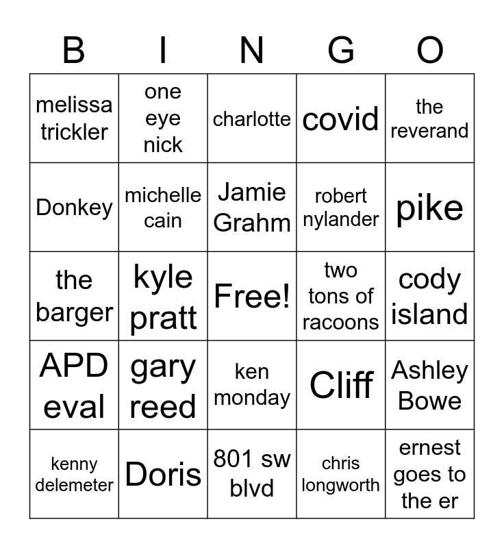 This bingo card has a free space and 24 words: gary reed, Doris, Jamie Grahm, kenny delemeter, the reverand, melissa trickler, Donkey, one eye nick, two tons of racoons, ken monday, robert nylander, the barger, Cliff, Ashley Bowe, michelle cain, chris longworth, cody island, charlotte, pike, kyle pratt, ernest goes to the er, APD eval, covid and 801 sw blvd.