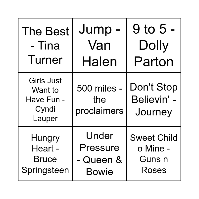 This bingo card has 31 words: Kiss - Prince, Don’t you Want me - Human League, I’m so Excited - Pointer Sisters, You Can Call Me Al - Paul Simon, The Best - Tina Turner, 9 to 5 - Dolly Parton, Hungry Heart - Bruce Springsteen, You Make My Dreams - Hall & Oates, I wanna dance - Whitney Houston, Come on Eileen - Dexys Midnight Runners, Africa - Toto, Footloose - Kenny Loggins, Take On Me - A-HA, Summer of ’69 - Bryan Adams, Down Under - Men At Work, You Give Love a Bad name - Bon Jovi, We Built this City - Starship, Video Killed the Radio Star - Buggles, Funky Town - Lipps Inc, Wake me up before you go go - Wham!, 500 miles - the proclaimers, never gonna give you up - Rick Astley, Red red wine - UB40, Jump - Van Halen, Sweet Child o Mine - Guns n Roses, Don't Stop Believin' - Journey, Girls Just Want to Have Fun - Cyndi Lauper, Super Freak - Rick James, Pour some sugar - Def Leppard, Under Pressure - Queen & Bowie and Safety Dance - Men Without Hats.