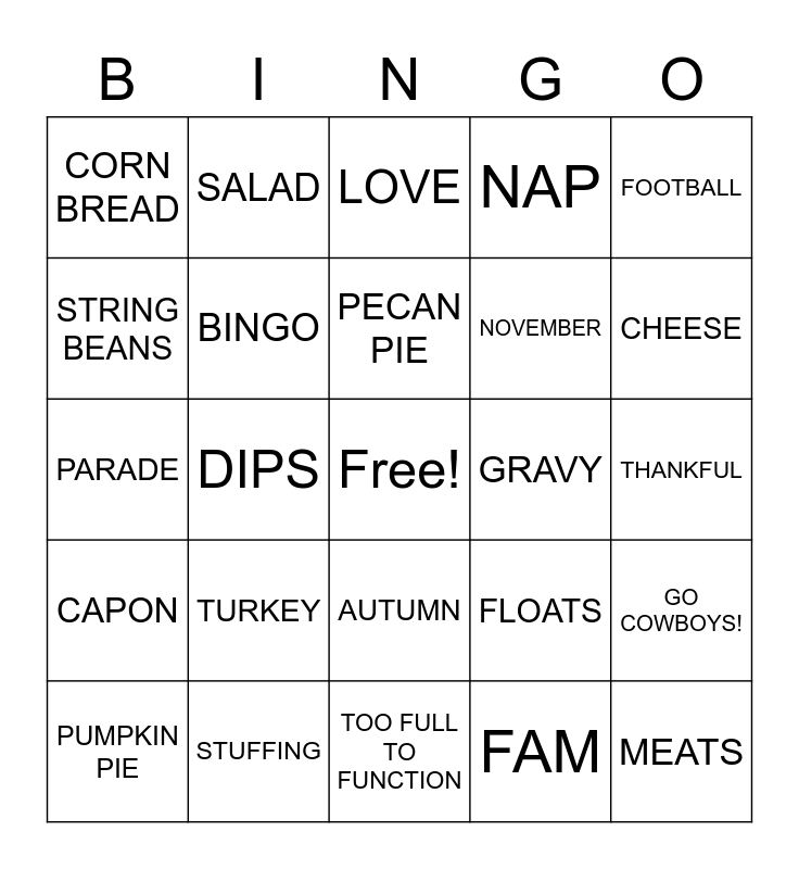 This bingo card has a free space and 24 words: TURKEY, STUFFING, PECAN PIE, PUMPKIN PIE, FOOTBALL, CORN BREAD, STRING BEANS, SALAD, GRAVY, AUTUMN, NOVEMBER, PARADE, FLOATS, GO COWBOYS!, BINGO, FAM, THANKFUL, LOVE, CHEESE, DIPS, MEATS, CAPON, NAP and TOO FULL TO FUNCTION.