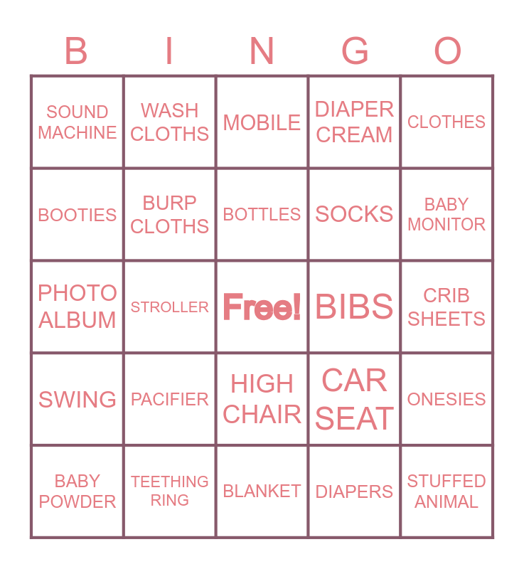 This bingo card has a free space and 24 words: PACIFIER, TEETHING RING, BOTTLES, BABY POWDER, CLOTHES, SOUND MACHINE, BOOTIES, WASH CLOTHS, BIBS, HIGH CHAIR, SOCKS, PHOTO ALBUM, CAR SEAT, ONESIES, BURP CLOTHS, DIAPERS, CRIB SHEETS, MOBILE, BABY MONITOR, STROLLER, STUFFED ANIMAL, SWING, DIAPER CREAM and BLANKET.