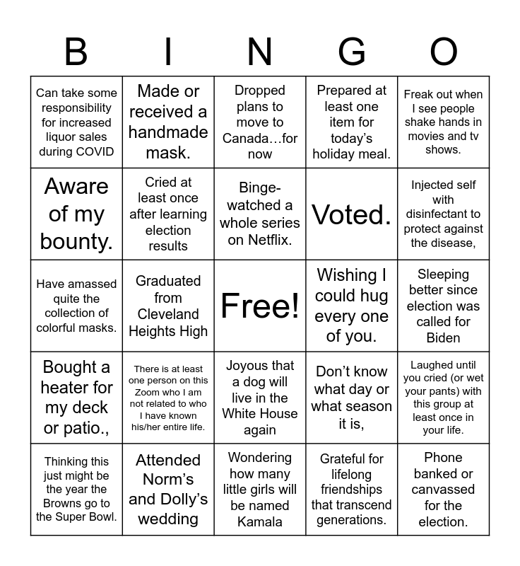 This bingo card has a free space and 30 words: Attended Norm’s and Dolly’s wedding, Graduated from Shaker Heights High, Graduated from Cleveland Heights High, Took a ride in Clyde, Can take some responsibility for increased liquor sales during COVID, Dropped plans to move to Canada…for now, Cried at least once after learning election results, Joyous that a dog will live in the White House again, Wishing I could hug every one of you., Wondering how many little girls will be named Kamala, Sleeping better since election was called for Biden, Phone banked or canvassed for the election., Grateful for lifelong friendships that transcend generations., Consider it a big achievement when a day begins with a shower., Injected self with disinfectant to protect against the disease,, Wear pants with a zipper at least once a week., Don’t know what day or what season it is,, Bought a heater for my deck or patio.,, There is at least one person on this Zoom who I am not related to who I have known his/her entire life., Freak out when I see people shake hands in movies and tv shows., Have amassed quite the collection of colorful masks., Engaged in at least one home improvement project., Made or received a handmade mask., Voted., Aware of my bounty., Prepared at least one item for today’s holiday meal., Laughed until you cried (or wet your pants) with this group at least once in your life., Thinking this just might be the year the Browns go to the Super Bowl., Binge-watched a whole series on Netflix. and Hoarding toilet paper..