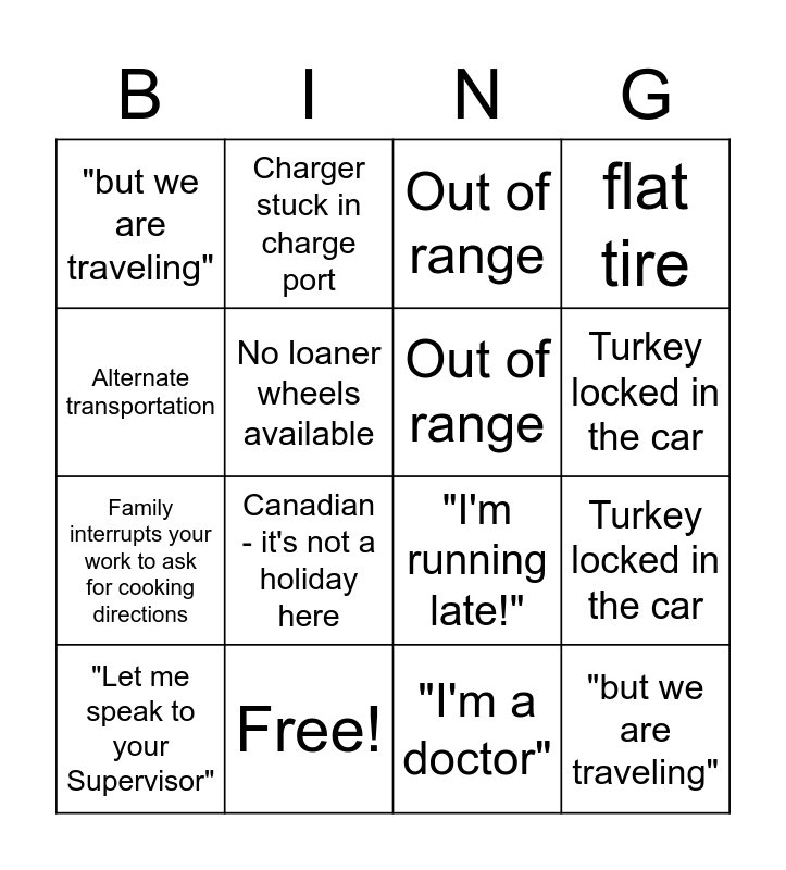 This bingo card has 16 words: Free!, Turkey locked in the car, Out of range, "but we are traveling", Family interrupts your work to ask for cooking directions, Charger stuck in charge port, "I'm running late!", "I'm a doctor", Alternate transportation, No loaner wheels available, "Let me speak to your Supervisor", flat tire, Canadian - it's not a holiday here, Turkey locked in the car, Out of range and "but we are traveling".