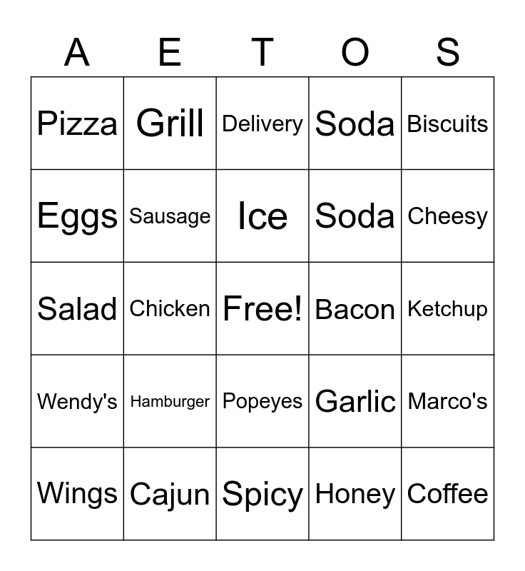 This bingo card has a free space and 29 words: Wings, Frosty, Chicken, Water, Pizza, Delivery, Sausage, Hamburger, Bacon, Cajun, Ketchup, Coffee, Spicy, Honey, Cheesy, Smoothie, Popeyes, Wendy's, Biscuits, Salad, Garlic, Eggs, Soda, Eggs, Soda, Grill, Marco's, Ice and Straws.