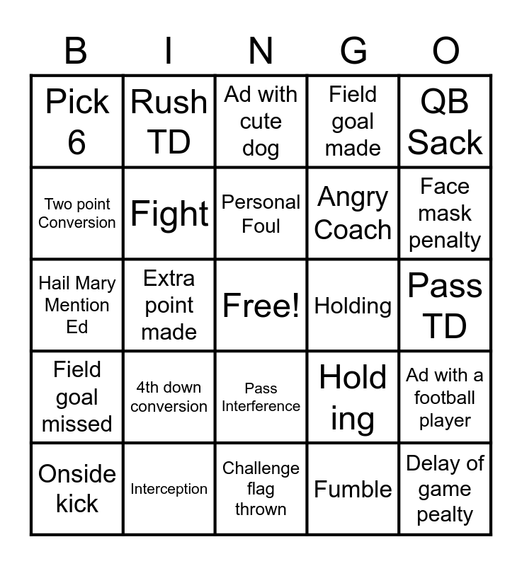 This bingo card has a free space and 26 words: Pass Interference, Fumble, Personal Foul, Interception, QB Sack, Pick 6, Two point Conversion, Rush TD, Pass TD, Hold ing, Angry Coach, Hail Mary Mention Ed, Ad with a football player, Onside kick, Extra point made, Extra point missed, Field goal made, Field goal missed, Ad with cute dog, Delay of game pealty, Face mask penalty, Challenge flag thrown, Holding, 4th down conversion, Fight and Unsportsmanlike conduct.
