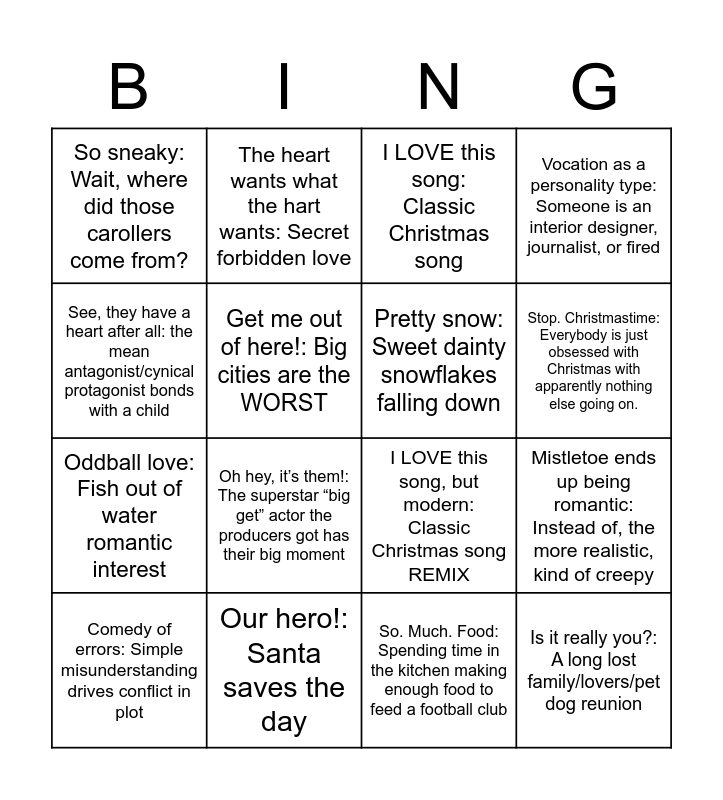 This bingo card has 22 words: Our hero!: Santa saves the day, Um TMI, Mom: Family is a little TOO involved in relationship dynamics, The heart wants what the hart wants: Secret forbidden love, Ruh-roh: The family business is more on the rocks than Uncle Jerry’s 3rd rum and coke., Get me out of here!: Big cities are the WORST, Pretty snow: Sweet dainty snowflakes falling down, So sneaky: Wait, where did those carollers come from?, I LOVE this song: Classic Christmas song, I LOVE this song, but modern: Classic Christmas song REMIX, Is it really you?: A long lost family/lovers/pet dog reunion, Oddball love: Fish out of water romantic interest, Vocation as a personality type: Someone is an interior designer, journalist, or fired, Someone HATES Christmas: But you know they’re going to come around in the end, Tripped over a Christmas tree into your arms: The romcom meet-cute but aggressively Christmas, So. Much. Food: Spending time in the kitchen making enough food to feed a football club, Fetch quest: It won’t be Christmas without that special item, Mistletoe ends up being romantic: Instead of, the more realistic, kind of creepy, Comedy of errors: Simple misunderstanding drives conflict in plot, Oh hey, it’s them!: The superstar “big get” actor the producers got has their big moment, See, they have a heart after all: the mean antagonist/cynical protagonist bonds with a child, Stop. Christmastime: Everybody is just obsessed with Christmas with apparently nothing else going on. and No one saw THAT coming: Ridiculous lie blows up in their face..
