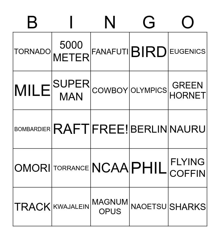 This bingo card has a free space and 25 words: TORRANCE, MAGNUM OPUS, COWBOY, TRACK, EUGENICS, TORNADO, MILE, 5000 METER, BERLIN, NCAA, OLYMPICS, BOMBARDIER, PHIL, FLYING COFFIN, SUPER MAN, WAKE, NAURU, FANAFUTI, GREEN HORNET, RAFT, SHARKS, KWAJALEIN, OMORI, BIRD and NAOETSU.