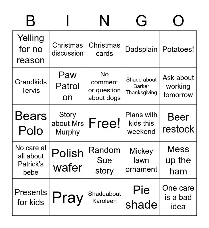This bingo card has a free space and 24 words: Polish wafer, Pray, No comment or question about dogs, Presents for kids, Potatoes!, Yelling for no reason, Grandkids Tervis, Christmas discussion, Plans with kids this weekend, Random Sue story, Shade about Barker Thanksgiving, Bears Polo, Mickey lawn ornament, Mess up the ham, Paw Patrol on, Pie shade, Beer restock, Christmas cards, Ask about working tomorrow, Story about Mrs Murphy, One care is a bad idea, No care at all about Patrick’s bebe, Dadsplain and Shadeabout Karoleen.