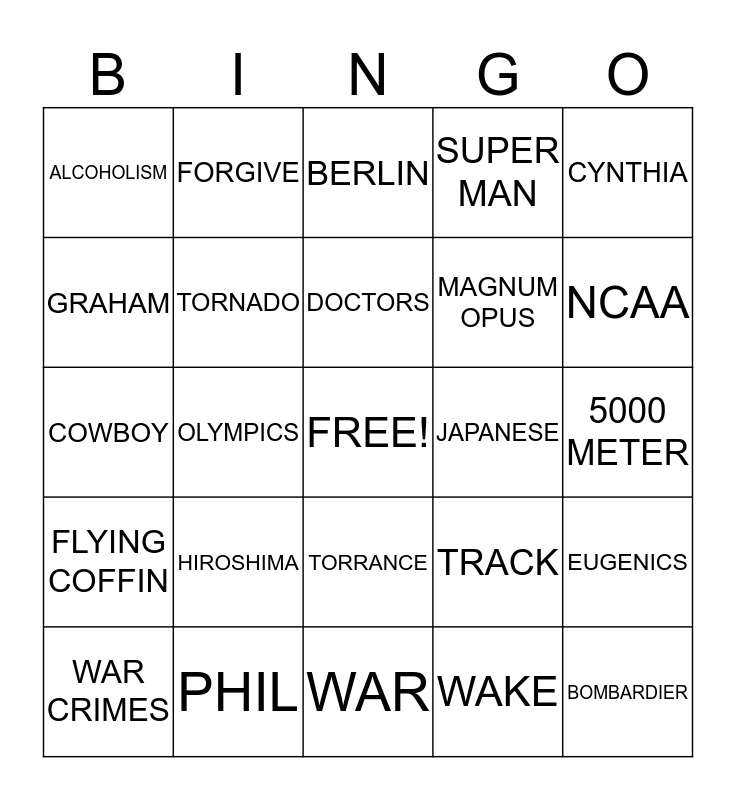 This bingo card has a free space and 25 words: HIROSHIMA, WAR, DOCTORS, WAR CRIMES, CYNTHIA, ALCOHOLISM, GRAHAM, FORGIVE, JAPANESE, TORRANCE, MAGNUM OPUS, COWBOY, TRACK, EUGENICS, TORNADO, MILE, 5000 METER, BERLIN, NCAA, OLYMPICS, BOMBARDIER, PHIL, FLYING COFFIN, SUPER MAN and WAKE.