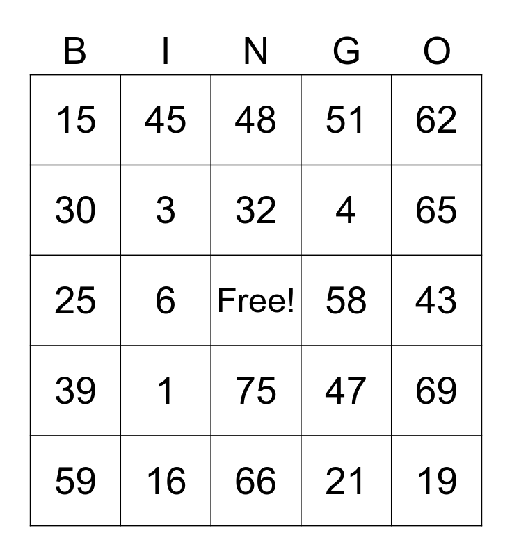 This bingo card has a free space and 24 words: 1, 16, 32, 59, 62, 15, 30, 45, 58, 75, 4, 25, 47, 69, 3, 21, 43, 48, 65, 6, 19, 39, 51 and 66.