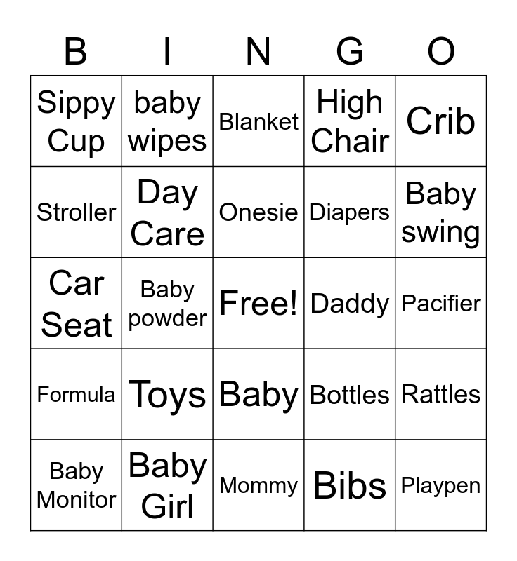 This bingo card has a free space and 26 words: Baby, Bibs, Onesie, Baby Girl, Crib, Sippy Cup, Stroller, baby wipes, Pacifier, Bottles, Diapers, Car Seat, Rattles, Baby Monitor, Baby powder, Lullaby, High Chair, Formula, Blanket, Playpen, Baby swing, Mommy, Daddy, Toys, Day Care and Rubber Ducky.