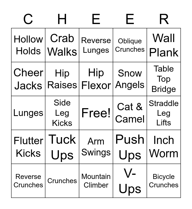 This bingo card has a free space and 34 words: Bridge, V-Ups, Splits, Superman, Flutter Kicks, Hip Raises, Wall Plank, Reverse Crunches, Crab Walks, Wall Sits, Hip Flexor, Reverse Lunges, Grapevine, Sumo Squats, Cat & Camel, Table Top Bridge, Crunches, Lunges, Tuck Ups, Push Ups, Arm Swings, Tricep Dips, Hollow Holds, Straddle Leg Lifts, Mountain Climber, Bicycle Crunches, Oblique Crunches, Lying Leg Lifts, Snow Angels, Cheer Jacks, Walking Lunges, Side Leg Kicks, Inch Worm and Pike Push Ups.