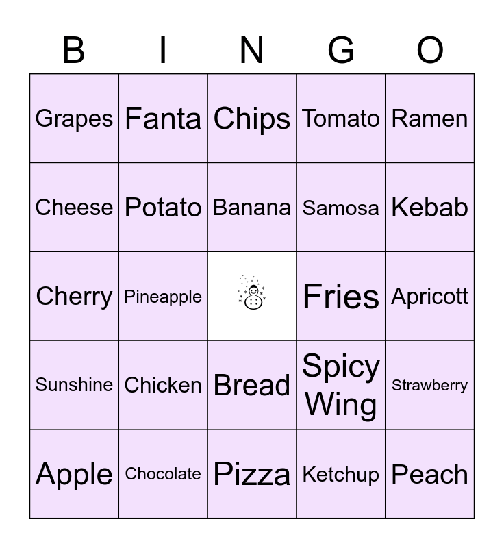 This bingo card has a free space and 39 words: Cactus, Carrot, Guava, Potato, Apple, Bread, Banana, Pasta, Ramen, Sunshine, Pineapple, Tomato, Peach, Apricott, Fries, Chicken, Pepsi, Grapes, Pear, Spicy Wing, Cheese, Pizza, Samosa, Kebab, Dew, Cake, Coffee, Cookies, Sprite, Fanta, Cucumber, Milk, Chips, Chocolate, Ketchup, Onions, Strawberry, Cherry and Watermelon.