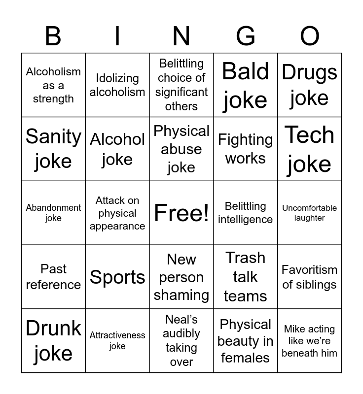 This bingo card has a free space and 33 words: Damnit Andy, Bad cuss word joke, Attack on physical appearance, Attack on behavior, Past reference, Alcohol joke, Drugs joke, Drunk joke, Idolizing alcoholism, Bad life choices, Physical abuse joke, Belittling choice of significant others, Belittling age, Degree worth, Belittling intelligence, Tech joke, Attractiveness joke, Abandonment joke, Sports, Trash talk teams, New person shaming, Relationship criticism, Alcoholism as a strength, Uncomfortable laughter, Neal’s audibly taking over, Mike acting like we’re beneath him, Bald joke, Fighting works, Sanity joke, Favoritism of siblings, Crotch jokes, Physical beauty in females and One word cuss word.
