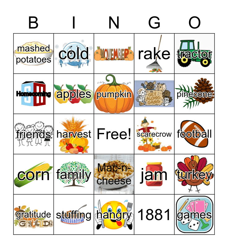 This bingo card has 32 images, a free space and 34 words: leaves, rain, pumpkin pie, apples, jam, corn, pumpkin, acorn, tractor, haystack, harvest, rake, berries, scarecrow, pinecone, mashed potatoes, gathering, family, games, football, turkey, stuffing, gratitude, hangry, cold, friends, Spelman, Homecoming, Reunion, Indigenous People, 1881, Mac-n-cheese, Black girl magic and BLM.