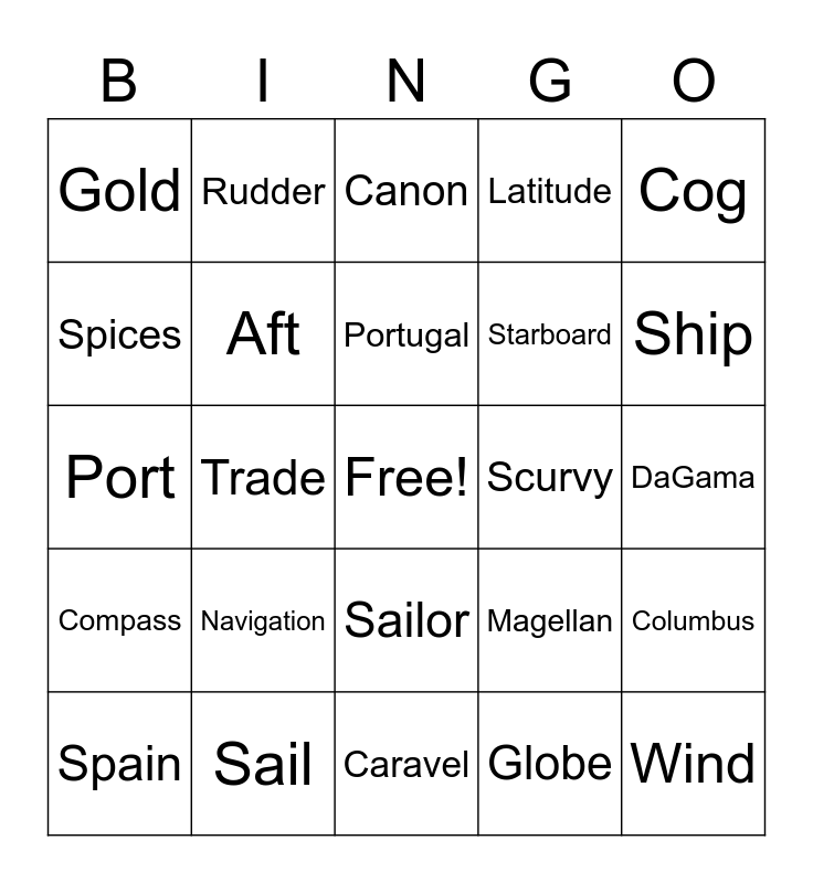 This bingo card has a free space and 25 words: Navigation, Caravel, Portugal, Spain, Cog, Gold, Spices, Rudder, Scurvy, Sailor, Starboard, Port, Magellan, Columbus, Aft, Stern, DaGama, Canon, Ship, Trade, Wind, Sail, Compass, Latitude and Globe.