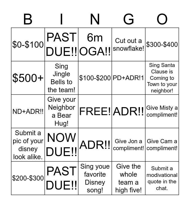 This bingo card has a free space and 24 words: NOW DUE!!, PAST DUE!!, $100-$200, $200-$300, $300-$400, $0-$100, $500+, PAST DUE!!, ADR!!, ADR!!, PD+ADR!1, ND+ADR!!, Give Jon a compliment!, Give Cam a compliment!, Sing Jingle Bells to the team!, Give the whole team a high five!, Give Misty a compliment!, 6m OGA!!, Sing Santa Clause is Coming to Town to your neighbor!, Give your Neighbor a Bear Hug!, Submit a modivational quote in the chat., Submit a pic of your disney look alike., Cut out a snowflake! and Sing youe favorite Disney song!.