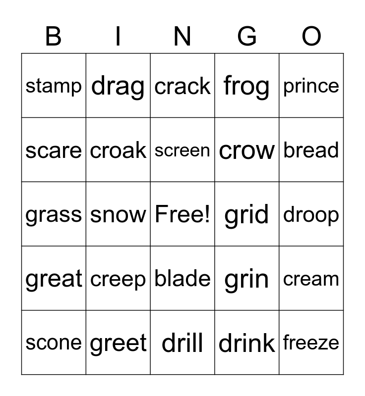 This bingo card has a free space and 29 words: scone, stomp, snow, sniff, stamp, crack, croak, creep, grid, greet, droop, freeze, drill, drink, bread, black, blade, great, prince, grass, grin, grape, crow, scare, frog, drag, cream, screen and steep.