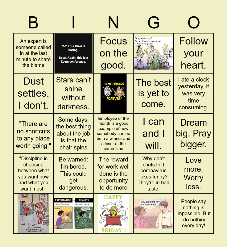 This bingo card has 27 images and 96 words: Free!, “Most people who work for themselves have achieved work-life imbalance.”, Home-work grew-up and became work-from-home, “When you work from home there is no such thing as a holiday.”, "There are no shortcuts to any place worth going.", "Discipline is choosing between what you want now and what you want most.", "You will never feel truly satisfied by work until you are satisfied by life.", "Don't wish it were easier. Wish you were better.", "Success isn't owned. It's leased, and rent is due every day.", "You will never find time for anything. If you want time, you must make it.", Why do they call it the novel coronavirus? It’s a long story…., What’s the best way to avoid touching your face? A glass of wine in each hand., If coronavirus isn’t about beer, why do I keep seeing cases of it?, Why don’t chefs find coronavirus jokes funny? They’re in bad taste., It may look like I'm doing nothing, but in my head I'm quite busy., My goal this weekend is to move... just enough so people don't think I'm dead., A balanced diet means a cupcake in each hand., Don't scare me, I fart easily., I'm not weird, I'm just limited edition., Be happy, it drives people crazy., Happiness does not have a price tag so smile., Make yourself at home... clean my kitchen., Be warned: I'm bored. This could get dangerous., Never take life seriously. Nobody gets out alive anyway. -, I'm a Nillionaire. I have little to no money!, Be bold, be italic, but never regular., Shopping is the only exercise I need., I love my six pack so much, I protect is with a layer of fat., Dear Diamond, we all know who is really a girl's best friend. Sincerely yours, Chocolate Cake., Life is always rocky when you're a gem., The best things in life are free. The rest are too expensive., The road to success is always under construction, Sometimes you succeed.... and other times you learn. - coolfunnyquotes.com, Life is too short to worry about matching socks. - coolfunnyquotes.com, No pressure, no diamonds., When nothing goes right, go left., Try Again. Fail again. Fail better., Impossible is for the unwilling., I can and I will., Take the risk or lose the chance., Good things happen to those who hustle., Dream big. Pray bigger., Grow through what you go through., Dream without fear. Love without limits., Fall seven times, stand up eight., Focus on the good., You are capable of amazing things, Focus on the journey, not the destination., Everything is going to be okay in the end. If it’s not the okay, it’s not the end., Live the moment., Follow your heart., You only live once., Never stop dreaming., Keep moving forward., Every moment matters., Love more. Worry less., Dust settles. I don’t., Nothing lasts forever., Work hard. Stay humble., The best is yet to come., Collect moments – not things., Feel the fear and do it anyway., I drive way too fast to worry about cholesterol., Why is the slowest traffic of the day called ‘rush hour’?, We were born to be real, not to be perfect., Stars can’t shine without darkness., Employee of the month is a good example of how somebody can be both a winner and a loser at the same time, My drug test came back negative. My dealer sure has some explaining to do, The problem isn’t that obesity runs in your family. The problem is no one runs in your family, Learn from the mistakes of others. You can’t live long enough to make them all yourself., I always arrive late at the office, but I make up for it by leaving early, Hard work never killed anybody, but why take a chance?, The remaining work to finish in order to reach your goal increases as the deadline approaches, The reward for work well done is the opportunity to do more, Everybody makes mistakes. The trick is to make mistakes when no one is looking., An expert is someone called in at the last minute to share the blame, If stress burned calories, I’d be a supermodel, If each day is a gift, I’d like to know where I can return Mondays, By working faithfully 8 hours a day you may eventually get to be boss and work 12 hours a day, Some days, the best thing about the job is that the chair spins, I stress about stress before there’s even stress to stress about., The best way to appreciate your job is to imagine yourself without one, What the world really needs is more peace and less paper work, Don’t worry, better days are coming. They are called Friday, Saturday and Sunday, My boss told me to have a good day.. so I went home., I need a six-month holiday, twice a year., They say don’t try this at home… so I went to my friend’s home!, Mom: Why is everything on the floor? Me: Gravity!, Life is short. Smile while you still have teeth., Just got that Friday feeling., People say nothing is impossible. But I do nothing every day!, I’m on a seafood diet. When I see food, I eat it., Work is where my comfort zone is., What do you call a guy with a rubber toe?, I ate a clock yesterday, it was very time consuming. and Where do you find a cow with no legs? Right where you left it..