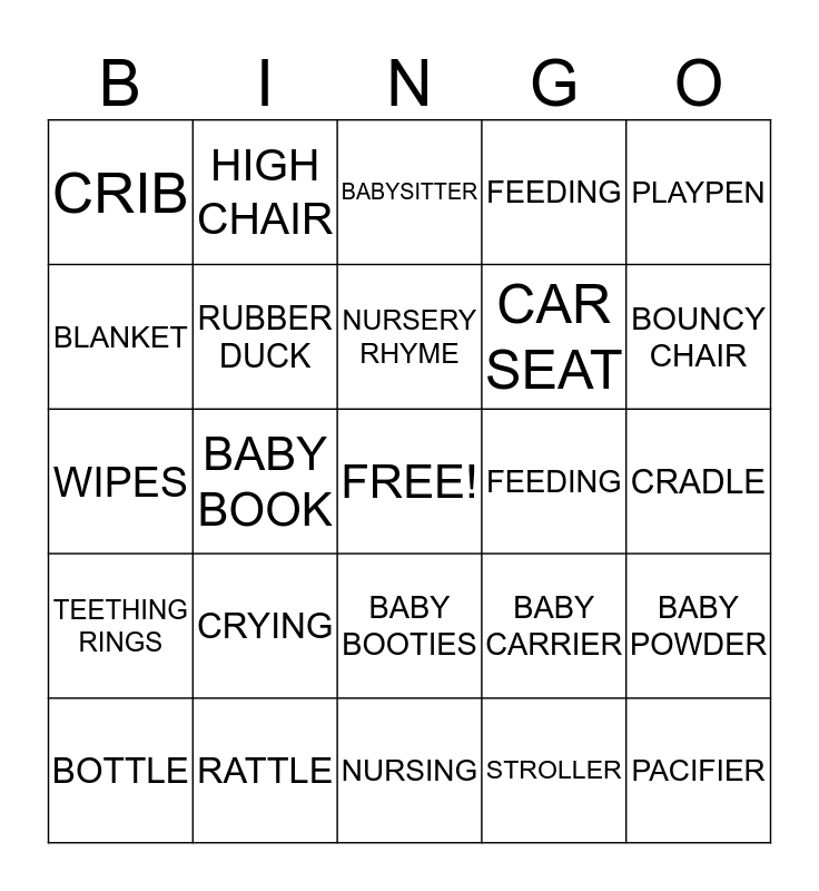 This bingo card has a free space and 24 words: CRYING, RATTLE, NURSERY RHYME, BOTTLE, PLAYPEN, CRIB, BLANKET, HIGH CHAIR, FEEDING, BABY BOOTIES, CAR SEAT, WIPES, BABY CARRIER, BABY POWDER, RUBBER DUCK, STROLLER, CRADLE, BABYSITTER, BOUNCY CHAIR, BABY BOOK, PACIFIER, TEETHING RINGS, FEEDING and NURSING.