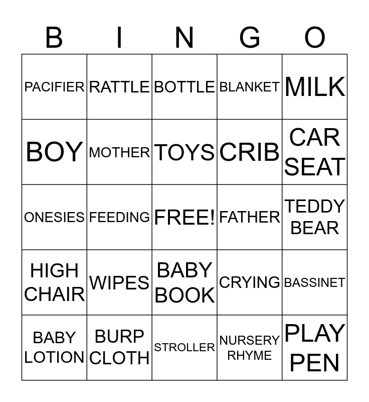 This bingo card has a free space and 24 words: WIPES, BURP CLOTH, TOYS, BABY LOTION, MILK, PACIFIER, BOY, RATTLE, FATHER, BABY BOOK, CRIB, ONESIES, CRYING, BASSINET, MOTHER, NURSERY RHYME, TEDDY BEAR, BOTTLE, CAR SEAT, FEEDING, PLAY PEN, HIGH CHAIR, BLANKET and STROLLER.