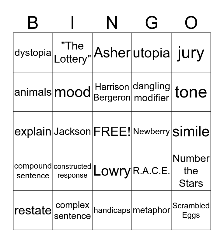 This bingo card has a free space and 24 words: constructed response, complex sentence, Harrison Bergeron, restate, jury, dystopia, animals, "The Lottery", Newberry, Lowry, dangling modifier, explain, R.A.C.E., Number the Stars, mood, metaphor, simile, Asher, tone, Jackson, Scrambled Eggs, compound sentence, utopia and handicaps.