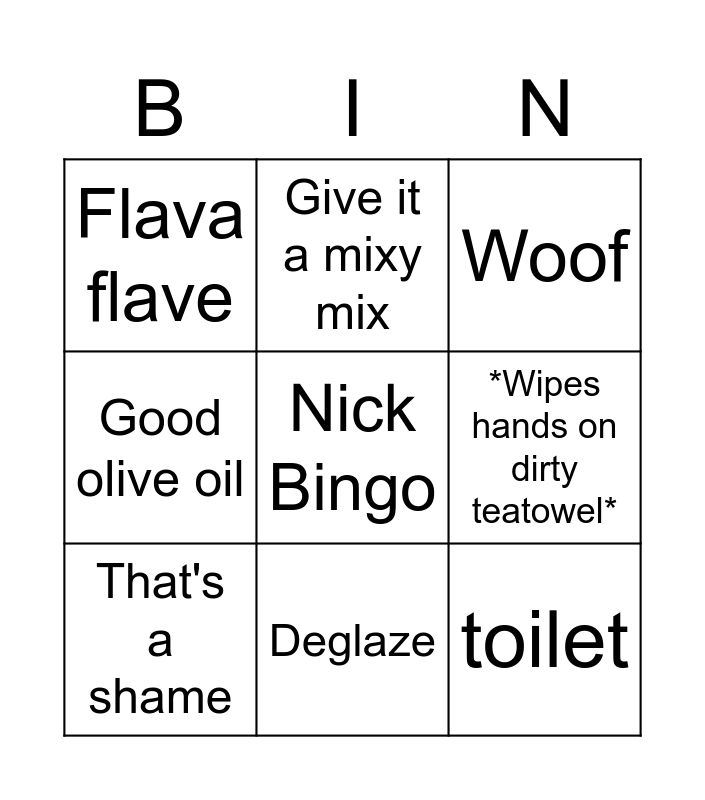 This bingo card has a free space and 11 words: Doesn't sound like me, Deglaze, toilet, That's a shame, Give it a mixy mix, Woof, *Wipes hands on dirty teatowel*, Finely dice, Good olive oil, Flava flave and Dece.