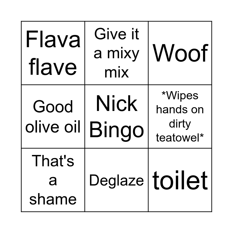 This bingo card has a free space and 11 words: Doesn't sound like me, Deglaze, toilet, That's a shame, Give it a mixy mix, Woof, *Wipes hands on dirty teatowel*, Finely dice, Good olive oil, Flava flave and Dece.