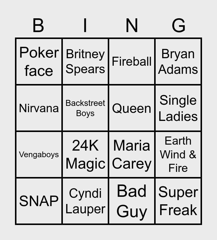 This bingo card has 16 words: Cyndi Lauper, Earth Wind & Fire, Fireball, Poker face, Vengaboys, Britney Spears, Maria Carey, Bad Guy, Nirvana, Backstreet Boys, SNAP, Bryan Adams, 24K Magic, Single Ladies, Queen and Super Freak.