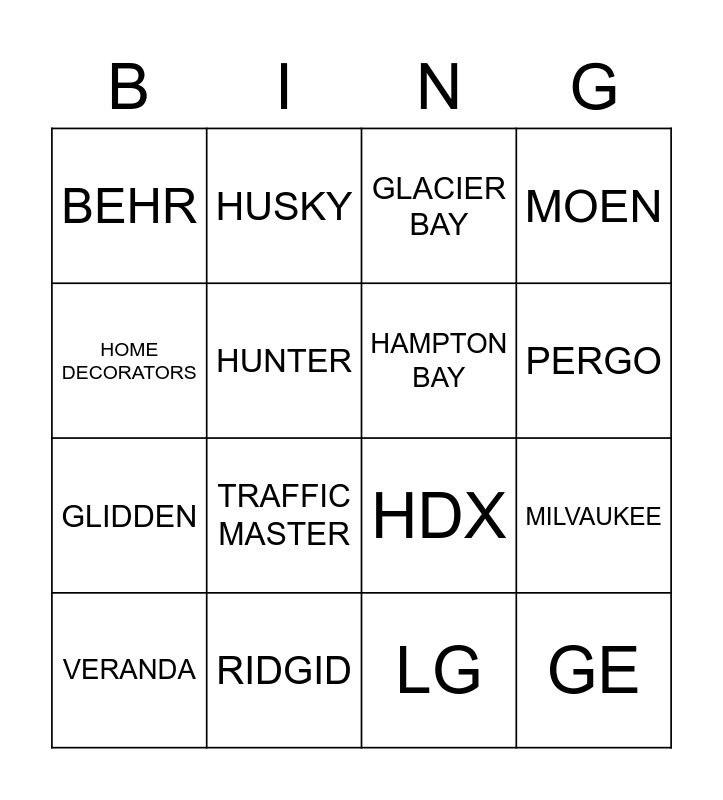 This bingo card has 25 words: Free!, AMERICAN STANDARD, PERGO, ANVIL, HOME DECORATORS, BEHR, HUNTER, HUSKY, RIDGID, FRIGIDAIRE, GLIDDEN, HDX, RYOBI, NEST, HAMPTON BAY, EVERBUILT, LG, GLACIER BAY, TRAFFIC MASTER, MILVAUKEE, VERANDA, DELTA, GE, MOEN and GAF.