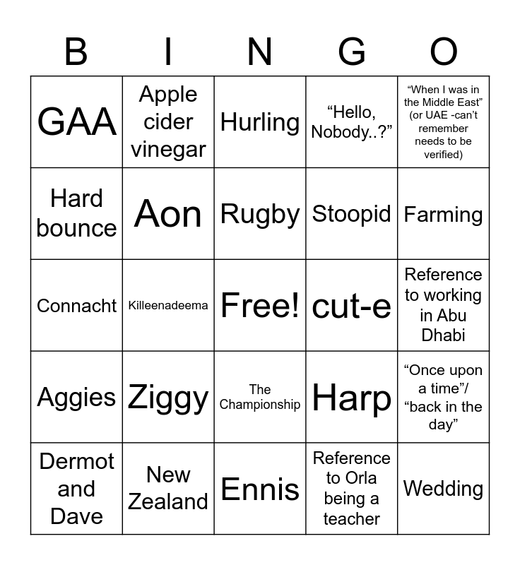 This bingo card has a free space and 31 words: Ennis, Orla, Killeenadeema, Man United, GAA, Hurling, Aon, Harp, cut-e, Reference to Orla being a teacher, Reference to working in Abu Dhabi, Wedding, Reference to Health & Safety, Ole, Farming, Bog/Turf, “Once upon a time”/ “back in the day”, Ziggy, Aggies, The Championship, “When I was in the Middle East” (or UAE -can’t remember needs to be verified), Tony Cascarino, Dermot and Dave, Apple cider vinegar, Stoopid, Hard bounce, “Hello, Nobody..?”, Connacht, New Zealand, Rugby and Ducks.