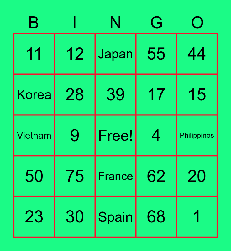 This bingo card has a free space and 29 words: 23, Brazil, 9, 47, 11, Japan, 28, 75, 4, 30, Philippines, 1, Spain, 68, 15, Russia, France, 50, 44, Vietnam, 62, 31, 17, Korea, 55, 12, 20, 39 and 73.