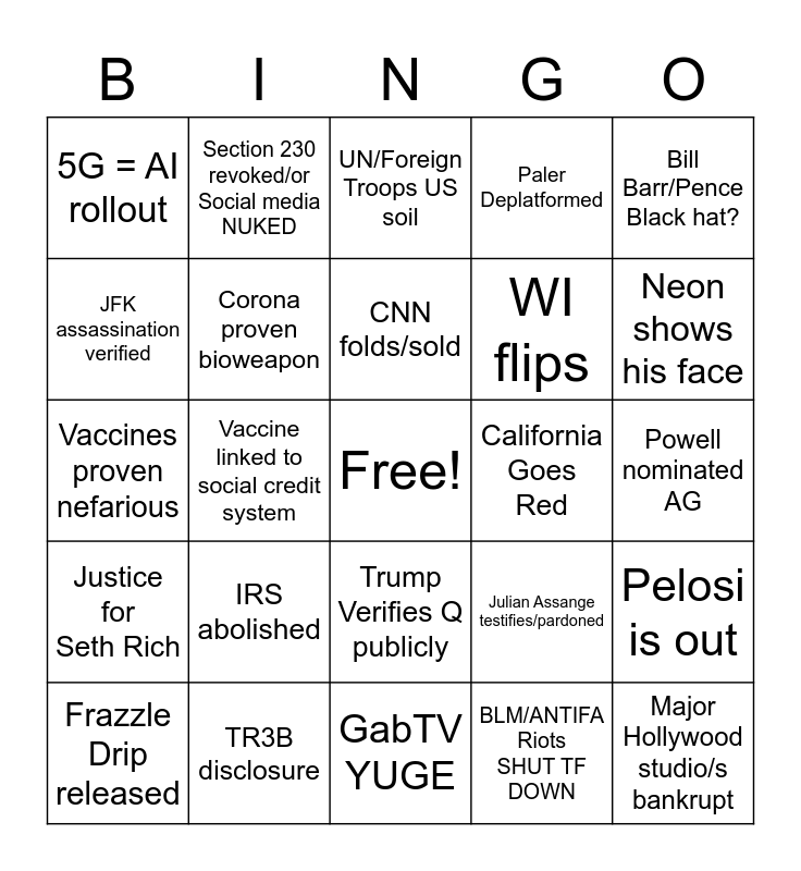 This bingo card has a free space and 24 words: IRS abolished, TR3B disclosure, CNN folds/sold, Frazzle Drip released, Bill Barr/Pence Black hat?, 5G = AI rollout, JFK assassination verified, Section 230 revoked/or Social media NUKED, California Goes Red, Trump Verifies Q publicly, WI flips, Vaccines proven nefarious, Julian Assange testifies/pardoned, Pelosi is out, Corona proven bioweapon, BLM/ANTIFA Riots SHUT TF DOWN, Powell nominated AG, UN/Foreign Troops US soil, Neon shows his face, Vaccine linked to social credit system, Major Hollywood studio/s bankrupt, Justice for Seth Rich, Paler Deplatformed and GabTV YUGE.
