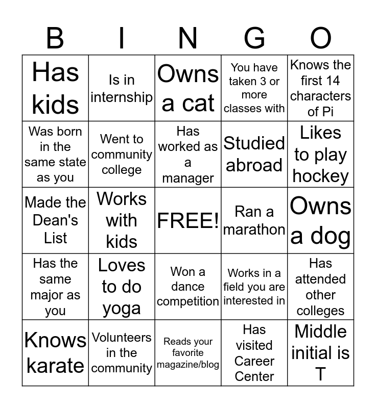 This bingo card has a free space and 25 words: Loves to do yoga, Reads your favorite magazine/blog, Has worked as a manager, Knows karate, Knows the first 14 characters of Pi, Has kids, Was born in the same state as you, Is in internship, Ran a marathon, Won a dance competition, Studied abroad, Made the Dean's List, Works in a field you are interested in, Has attended other colleges, Went to community college, Plays chess, Owns a dog, Owns a cat, Likes to play hockey, Works with kids, Middle initial is T, Volunteers in the community, Has the same major as you, You have taken 3 or more classes with and Has visited Career Center.