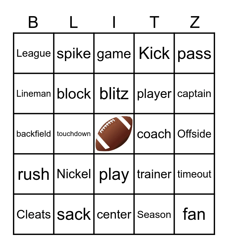 This bingo card has a free space and 80 words: fourth, Fumble, game, goal, Grounding, guard, Halftime, Helmet, Holding, huddle, incomplete, interception, Kick, League, linebacker, Lineman, NFL, Nickel, offense, Offside, overtime, pass, backfield, blitz, block, Block, Blocking, bootleg, Bowl, Bowl, captain, Catch, center, chain, Cleats, coach, conversion, defense, down, fan, field, first, Flicker, Foul, snap, spike, tackle, tackle, team, third, timeout, touchdown, trainer, Turnover, umpire, whistle, wildcard, yards, pigskin, play, player, Pocket, point, punt, quarter, quarterback, receiver, referee, replay, running, rush, sack, safety, score, Scrambling, scrimmage, Season, seats, second and shotgun.