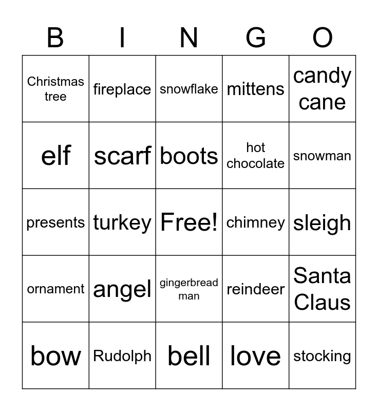 This bingo card has a free space and 25 words: angel, bell, boots, bow, candy cane, Christmas tree, elf, fireplace, chimney, gingerbread man, hot chocolate, presents, reindeer, Santa Claus, scarf, sled, sleigh, snowflake, snowman, turkey, stocking, Rudolph, ornament, mittens and love.