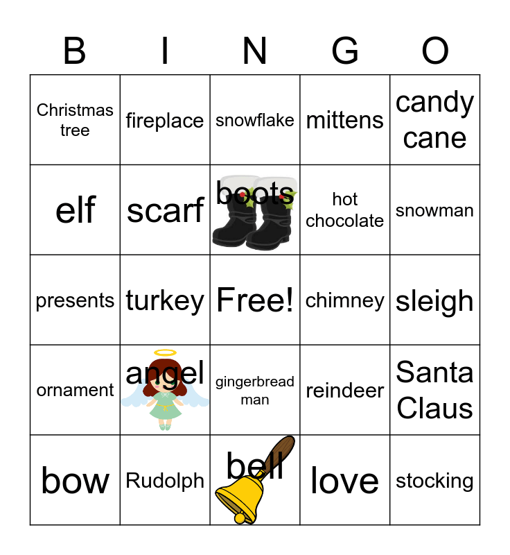This bingo card has 3 images, a free space and 25 words: angel, bell, boots, bow, candy cane, Christmas tree, elf, fireplace, chimney, gingerbread man, hot chocolate, presents, reindeer, Santa Claus, scarf, sled, sleigh, snowflake, snowman, turkey, stocking, Rudolph, ornament, mittens and love.