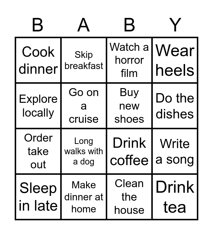 This bingo card has 47 words: Free!, Sleep in late, Read a book, Travel the world, Shop at the grocery store, Hike the mountain, Skip breakfast, Watch Netflix, Go on a cruise, Wear flats, Buy new shoes, Wear heels, Write a poem, Chinese takeout, Drink Pepsi, Walk the beach, Do the dishes, Make dinner at home, Karaoke, Explore locally, Write a song, Drink Coke, Cook dinner, Order take out, Explore locally, Long walks with a dog, On Instagram, Live in the city, Go camping, Drink tea, Curl up with a cat, Receive diamonds, Receive pearls, Skip lunch, Watch a chick flick, Travel overseas, Clean the house, On Snap chat, Buy a new purse, Shop at farmer's market, Mexican takeout, Watch a horror film, Drink coffee, Get up early, Live in the country, Dance party and Work out at the gym.
